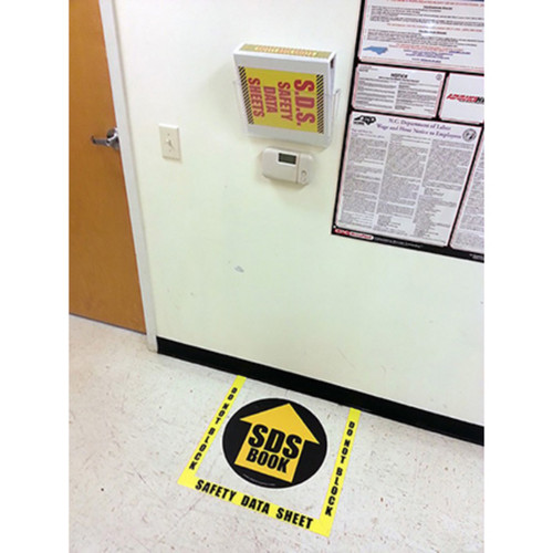The SDS floor marking kit featuring Superior Mark® floor tape borders indicates data sheet location with a bright yellow/black rubber sign.