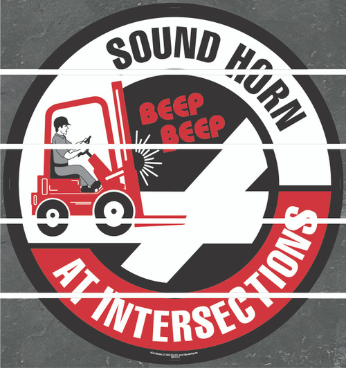 Protect your workers in heavy traffic. This black and red Sound Horn at Intersection floor sign features bold text and a forklift graphic to quickly convey this safety message. Pick the size and material that best fits your facility. Our forklift sound horn signs are available in Superior Mark, vinyl, rubber, or inlaid mesh. Our floor signs are designed with durability in mind.