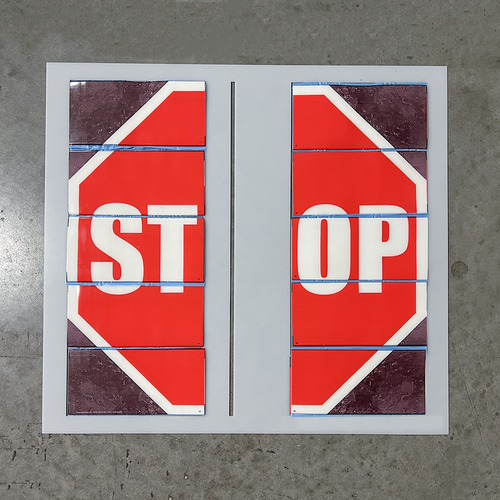 Template for aligning and positioning The Superior Mark® 10 piece split stop sign kit.