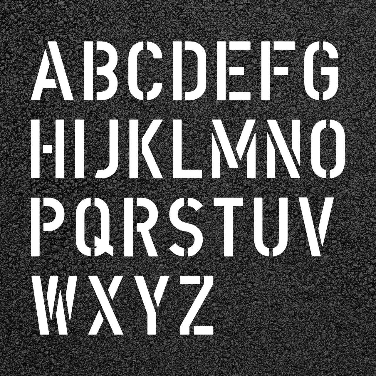 | 24" x 16" Letter Stencil Kit | 24" x 16" | 4" Vertical, 4" Horizontal | 28" x 22" | 4" between letters, 24" between words |