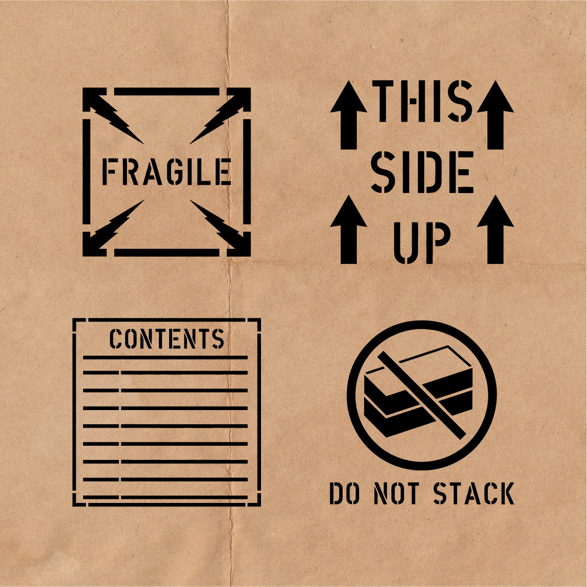 The industrial shipping stencils in this 4-piece stencil kit are made from high-quality polyethylene plastic designed to be used multiple times. We recommend using aerosol paint and a marking gun for fast, hassle-free shipping safety stencil application. Quickly and easily post package safety instructions indicating which side is up, whether the package is fragile or stackable, and package contents. Ideal for any warehouse or distribution facility, shipping stencils can be applied on any surface using aerosol paint.