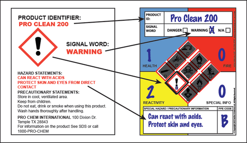 This label makes it easy to translate the NFPA and/or HMIS language into the GHS label.