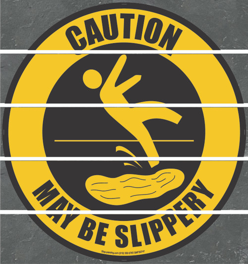 This caution slippery floor sign is available in Superior Mark, rubber, or mesh, and 17.5" or 22" diameter. The vibrant yellow and black caution color scheme ensures that this floor safety sign will be easy to see, and it features an image of a man slipping on liquid to make the message clear to understand even for non-English speaking individuals. Use this eye catching floor sign to improve warehouse and workplace safety.