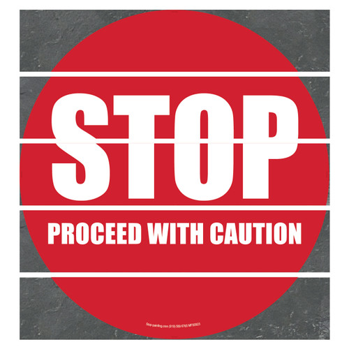 This Stop Proceed with Caution Floor Sign features white text against a contrasting red background for clear visibility. This round floor sign is available in Superior Mark®, Rubber, Vinyl, or Mesh and in 17.5 inch or 22 inch sizes.