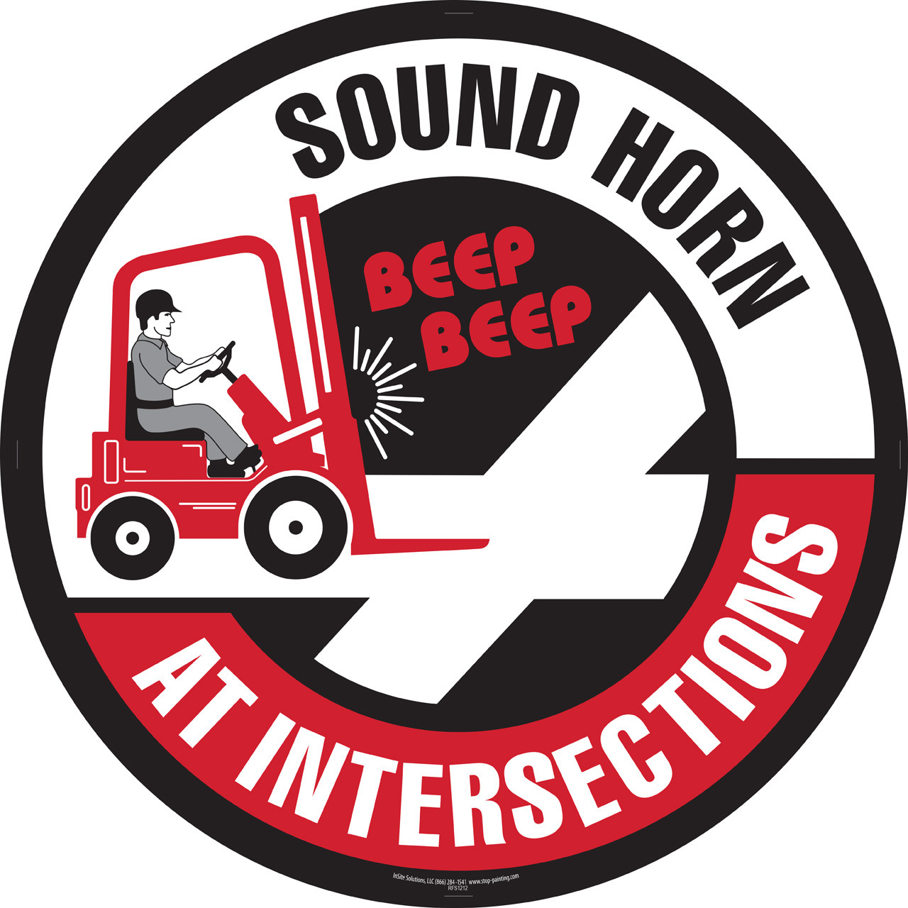 Protect your workers in heavy traffic. This black and red Sound Horn at Intersection floor sign features bold text and a forklift graphic to quickly convey this safety message. Pick the size and material that best fits your facility. Our forklift sound horn signs are available in Superior Mark, vinyl, rubber, or inlaid mesh. Our floor signs are designed with durability in mind.